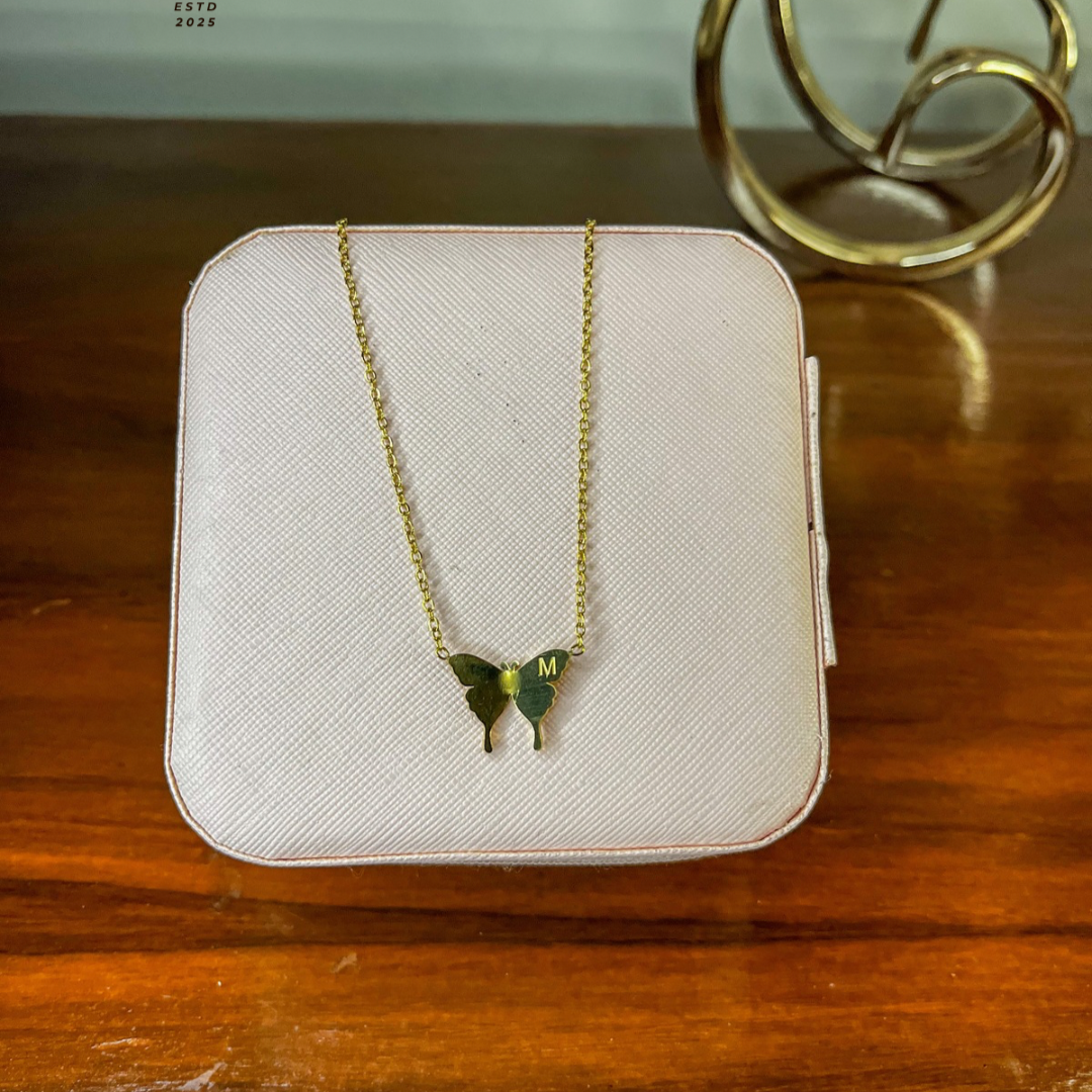 Butterfly Charm Necklace – Gold Finish, Stainless Steel with Monogram Detail